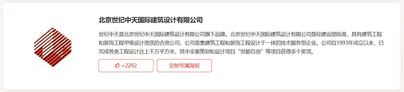 世纪中天是世纪中际建建设想无限公司旗下品牌。世纪中际建建设想无限公司是经扶植部核准,具有建建工程和粉饰工程甲级设想天分的合伙公司,公司是集建建工程和粉饰工程设想于一体的手艺办事型企业。公司自1993年成立以来,已完成各类工程设想达上万万平方米,此中全案筹谋和设想项目“世都百货”等项目获得多个项。