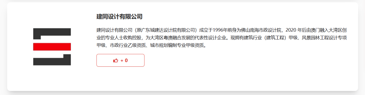建同设想无限公司(原广东城建达设想院无限公司)成立于1996年前身为佛山南海市政设想院,2020 年后由澳门融入大湾区创业的专业人士收购控股,为大湾区粤澳融合成长的代表性设想企业。现具有建建行业(建建工程)甲级、风光园林工程设想专项甲级、市政行业乙级天分、城市规划编制专业甲级天分。