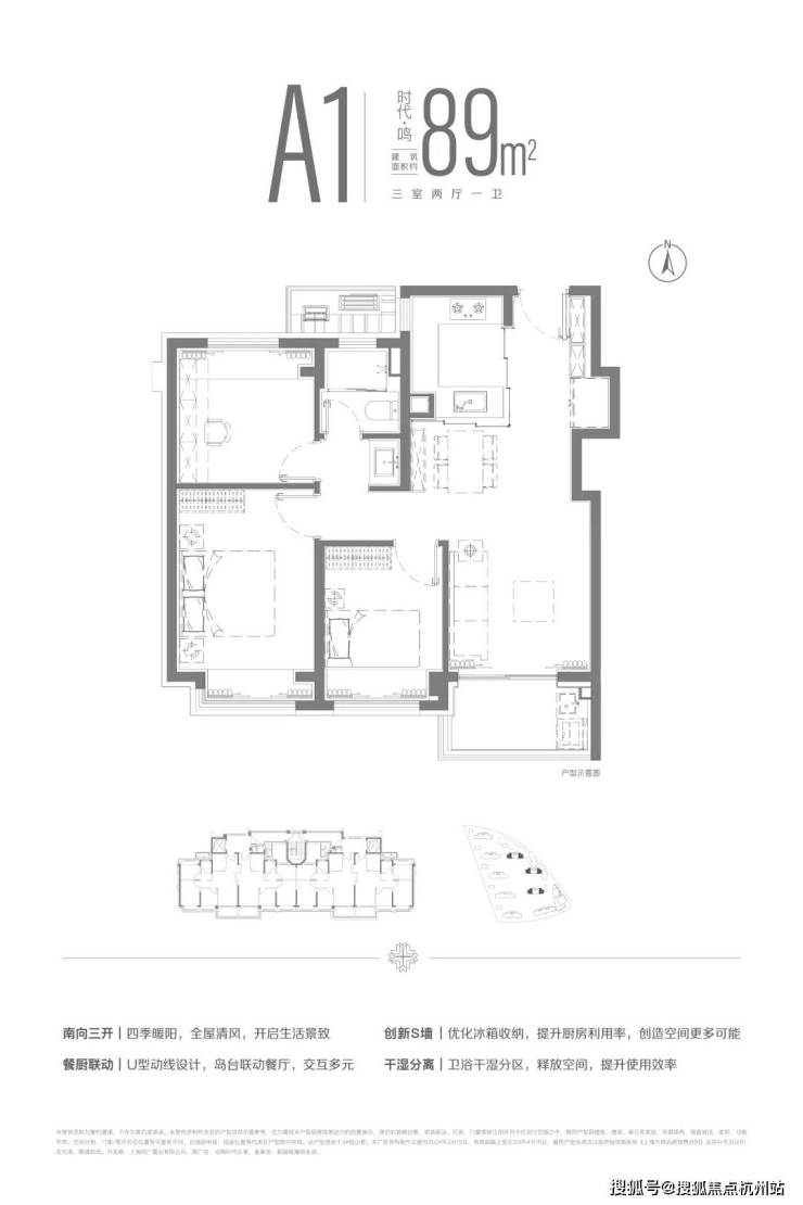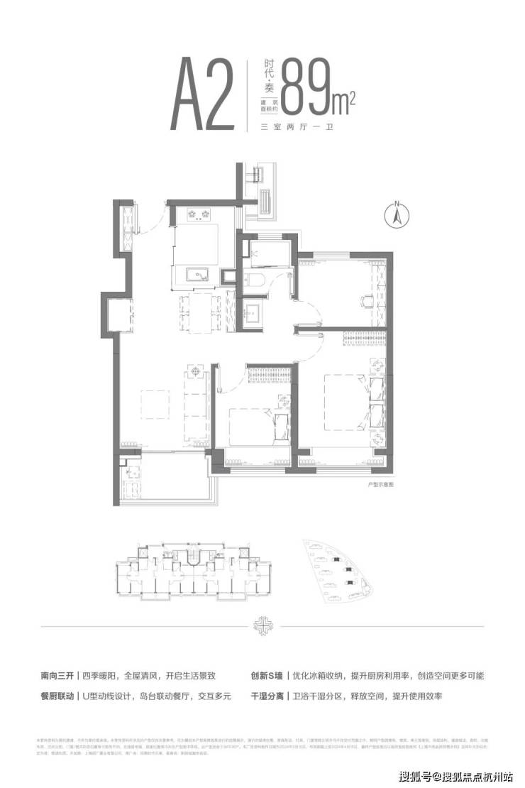 建面约89m²三房两厅一卫户型,LDKB一体化设想,南向三开间结构,全明空间设想。让四时流转于糊口之中,用天然营制糊口的惬意。
